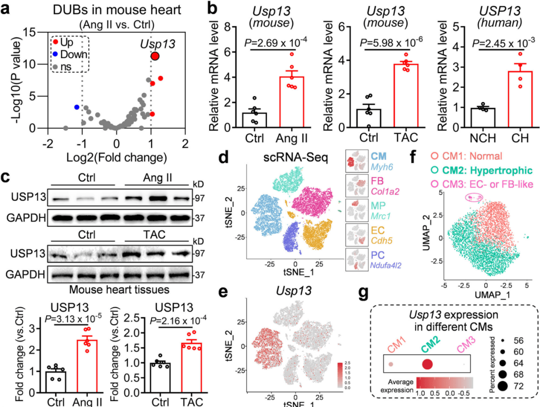 研究人员在先前发表的转录组数据中发现Usp13基因表达的上调。随后确认了Ang II和TAC诱导的小鼠心脏中Usp13 mRNA水平上调,以及人类肥厚型心肌,相较于正常对照组。最后在单细胞转录组结果中确定心脏中USP13上调的细胞来源是心肌细胞(图1)。