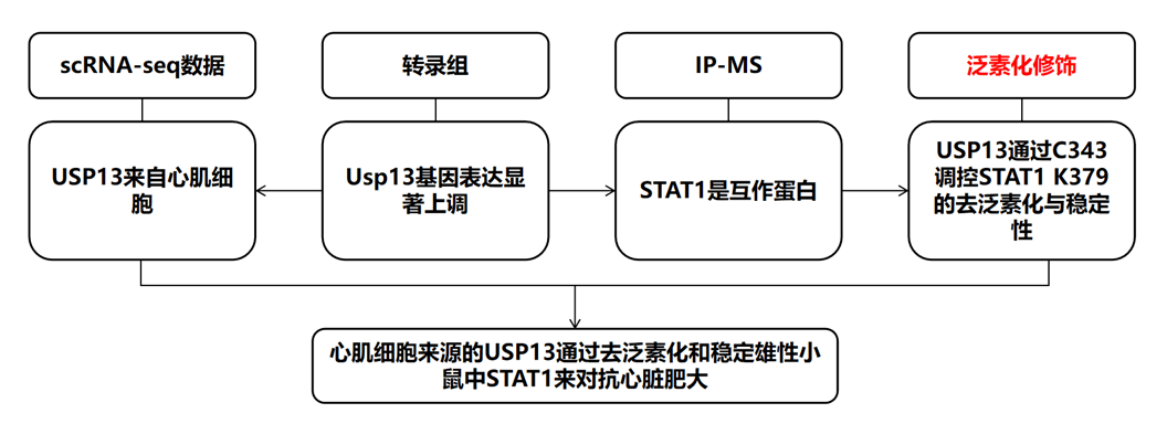 中文标题:心肌细胞来源的USP13通过去泛素化和稳定雄性小鼠的STAT1来保护心脏免受肥大