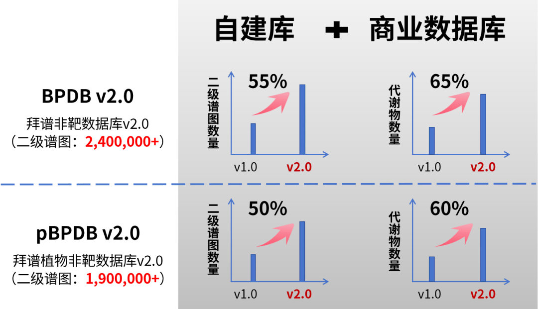 拜谱非靶数据库(BPDB v2.0):二级谱图数量超 240 万,代谢物数量较 v1.0 提升 65%,覆盖更广泛的物种与代谢通路